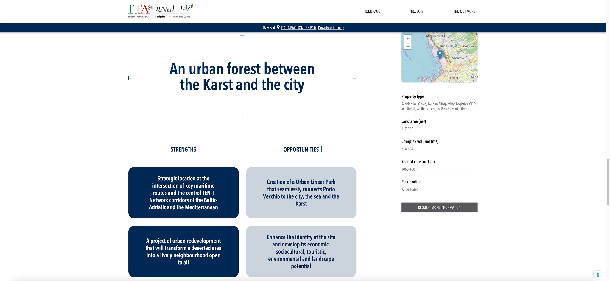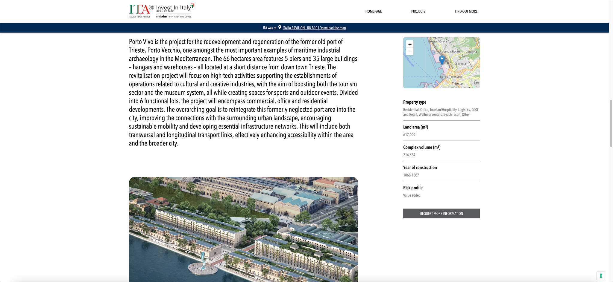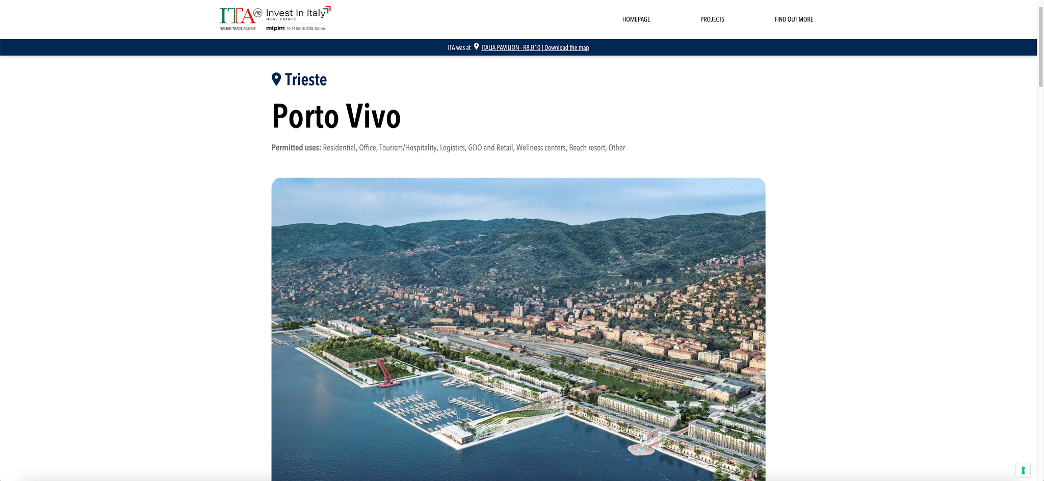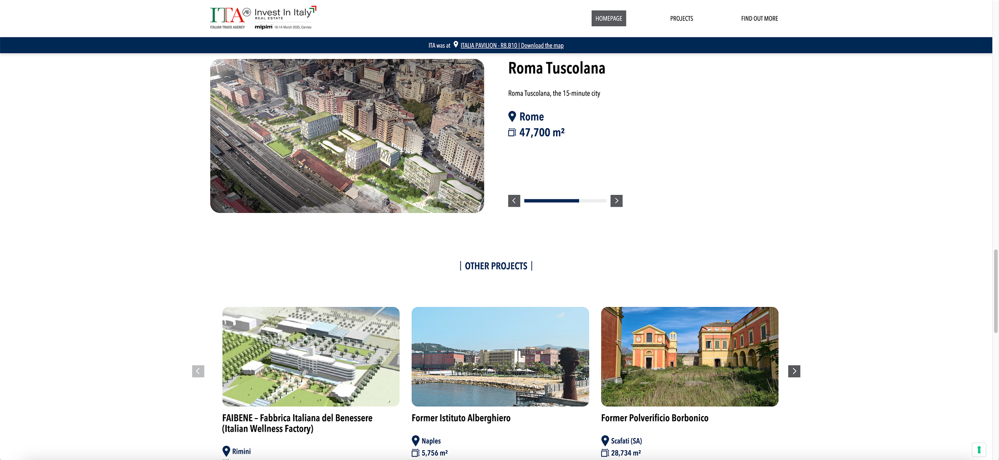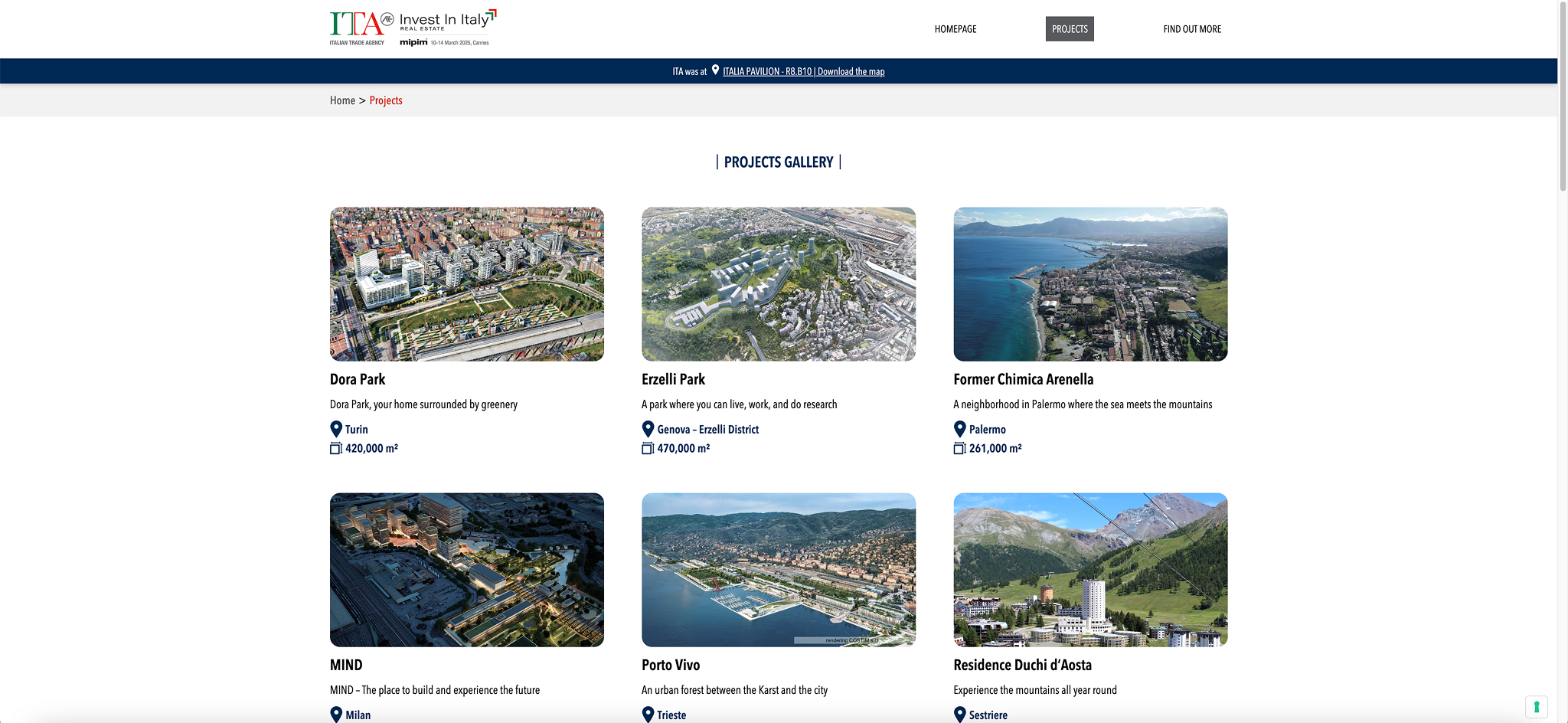 ICE – Agenzia per la promozione all’estero e l’internazionalizzazione delle imprese italiane, nota anche come Italian Trade Agency (ITA) è un’agenzia governativa italiana impegnata nello sviluppo del commercio con l’estero. Per la partecipazione dell’ente governativo al MIPIM (fiera internazionale di riferimento per il settore del real estate, dell’edilizia e del mercato immobiliare.) del 2025, ho realizzato il design di un mini-sito web adibito all’esposizione dei progetti, e di un video showcase di tutti i progetti, utilizzato nella sezione hero della homepage. Ho inoltre lavorato direttamente con tutti i partner coinvolti nel progetto, assumendo un ruolo di project manager, e seguendo la ricezione di tutti i materiali da tutti gli attori coinvolti, per il corretto inserimento all’interno del sito.